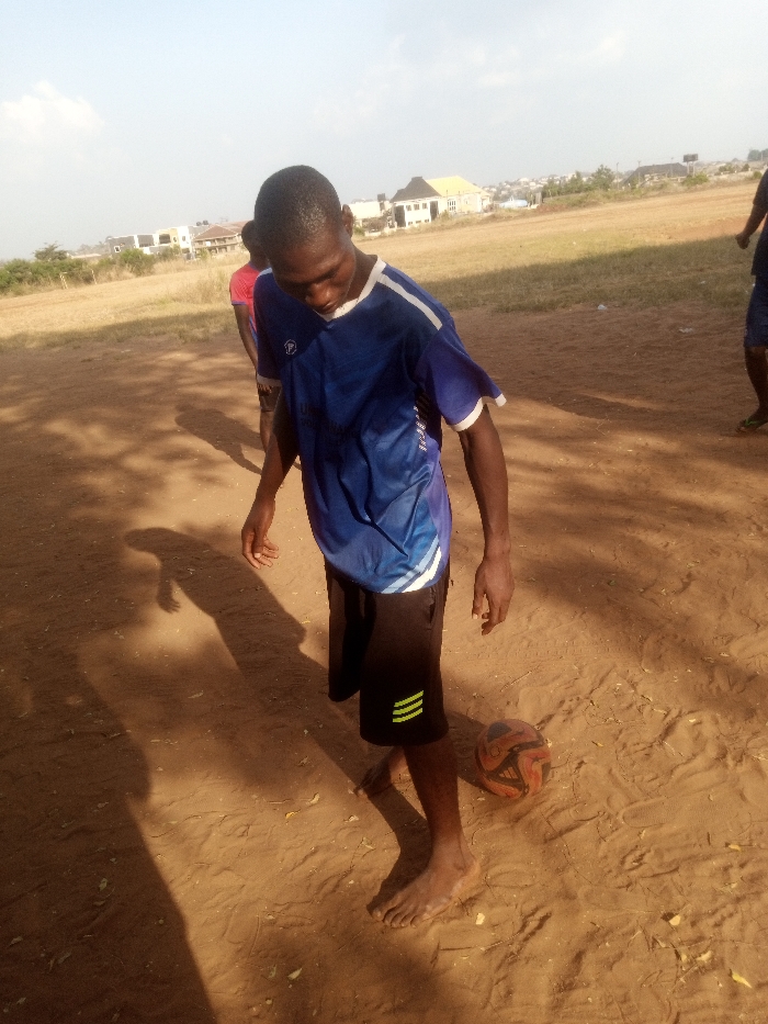 A young man in a blue soccer jersey and black shorts stands barefoot on a dirt field, looking down at a soccer ball resting near his feet. Two other figures are visible in the background, one wearing red and another partially obscured. Houses are seen in the distance. The lighting suggests a sunny day, casting a shadow of the main figure onto the ground. The overall scene depicts a casual soccer setting.