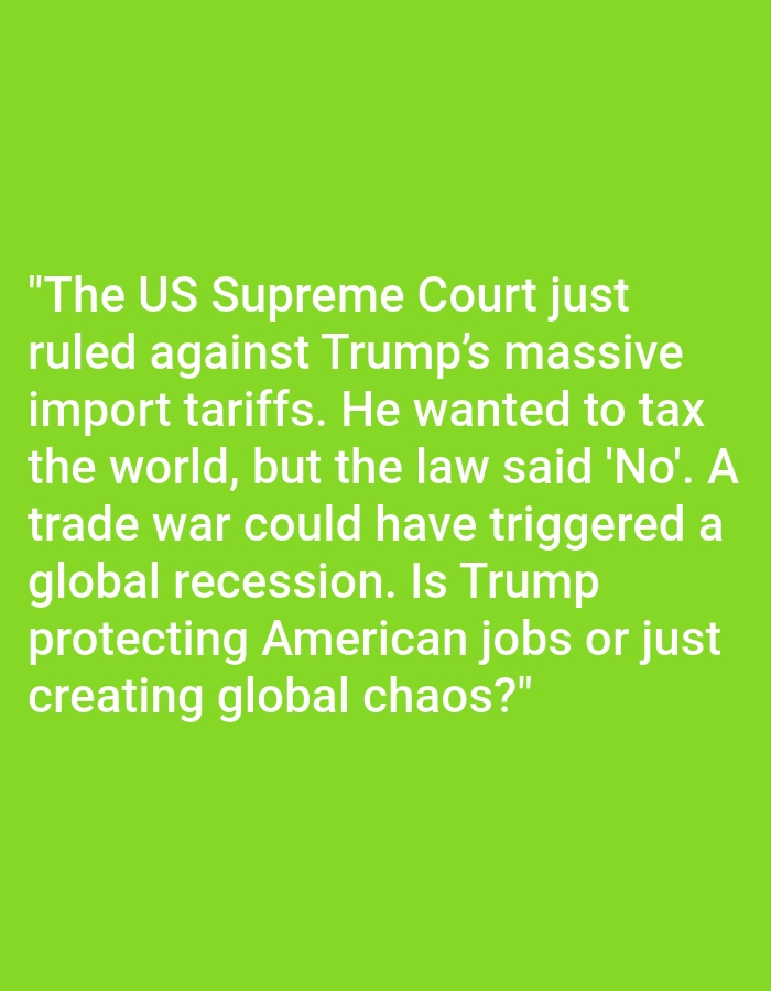 The image displays white sans-serif text set against a solid, uniform lime green background. The text, centered horizontally within the frame, reads: "The US Supreme Court just ruled against Trump's massive import tariffs. He wanted to tax the world, but the law said 'No'. A trade war could have triggered a global recession. Is Trump protecting American jobs or just creating global chaos?". No individuals, physical objects, or environmental details are visible. The image provides no information regarding the city of Гава, Kyrgyzstan, or any other geographical location.