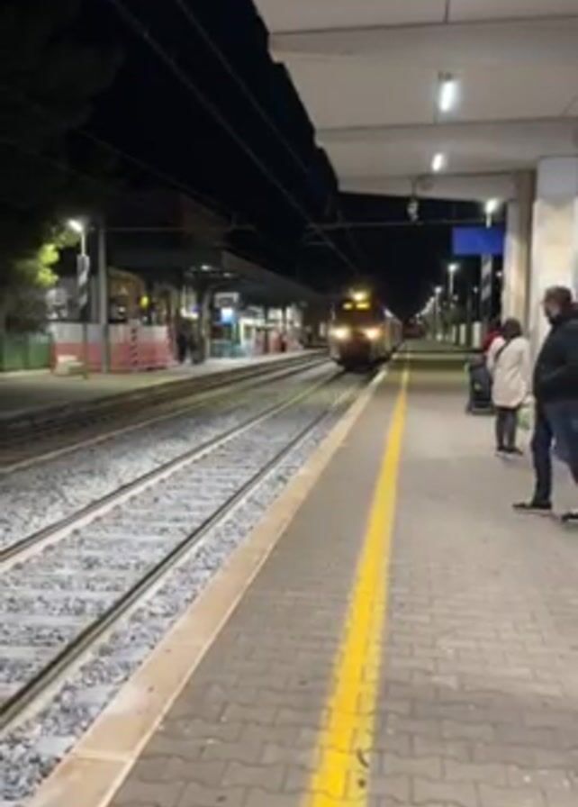 At night, a Trenitalia train approaches a train station platform where several people stand waiting