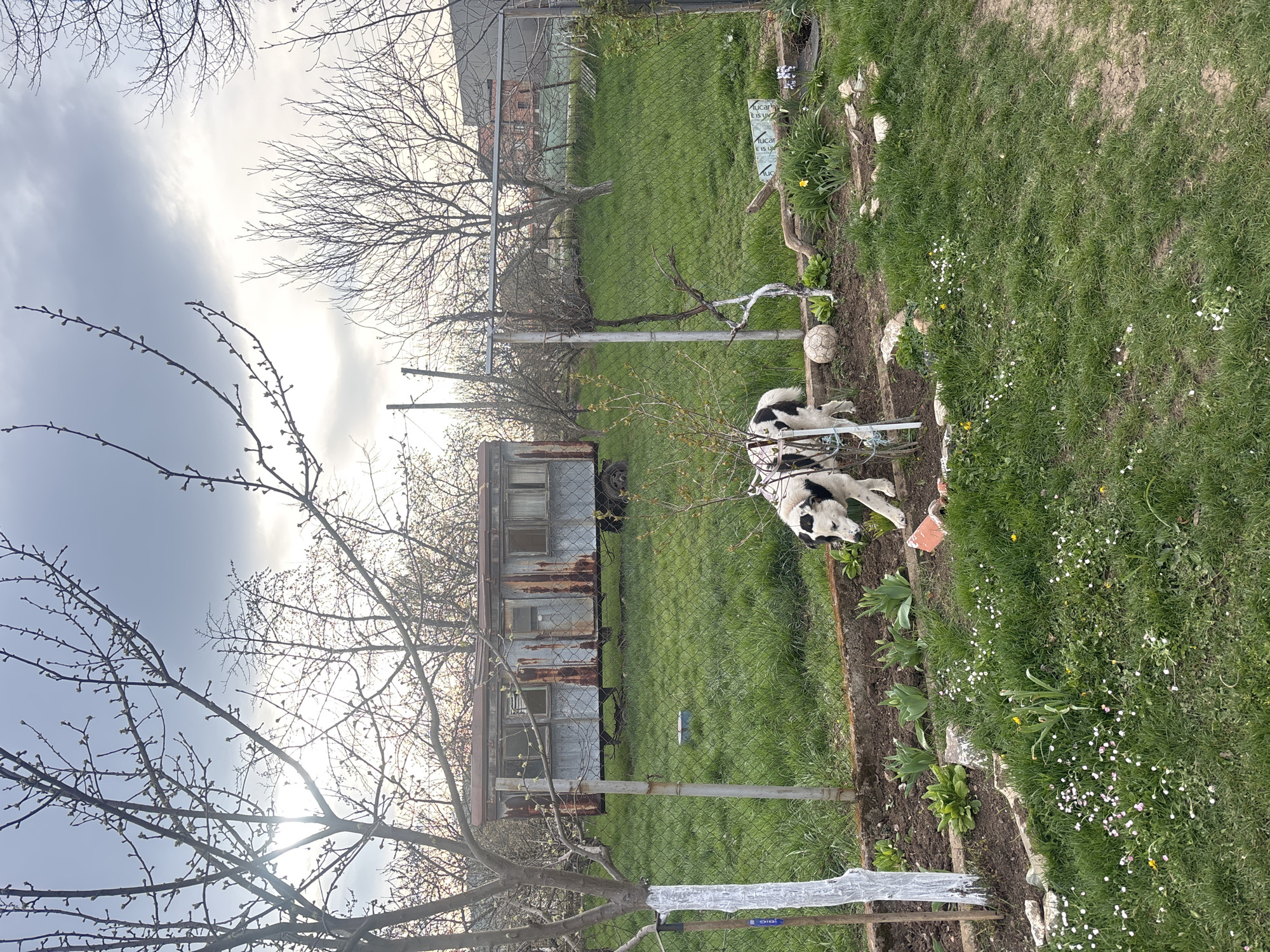 The image depicts an outdoor scene in what appears to be a garden or yard in Dolna Dikanya, Bulgaria. A black and white dog is lying down near a flower bed, which contains white flowers, unidentified green plants, and some landscaping rocks. A soccer ball is present near the dog. In the background, a chain-link fence separates the yard from a grassy area. Beyond the fence, a rusty metal structure with windows is visible, along with trees and a building with a brick facade. The sky is overcast. The bare branches of trees are visible in the foreground and background. An implement with a white handle is present.