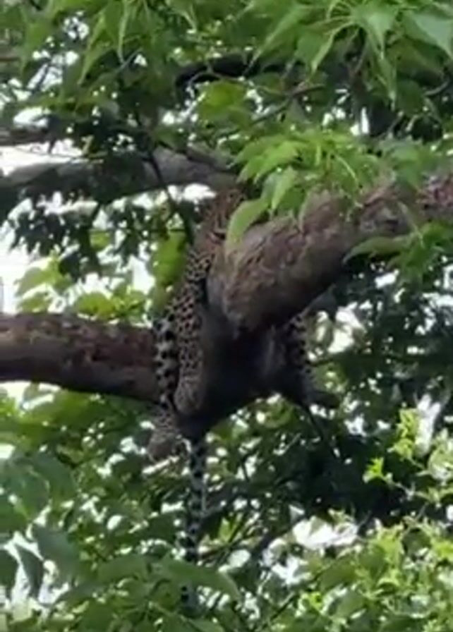 leopard lying on a tree branch among green leaves. The animal's spotted coat is visible, and its tail hangs down. The shot is taken from below, looking up at the leopard in the tree. The light is diffused, suggesting an overcast day.
