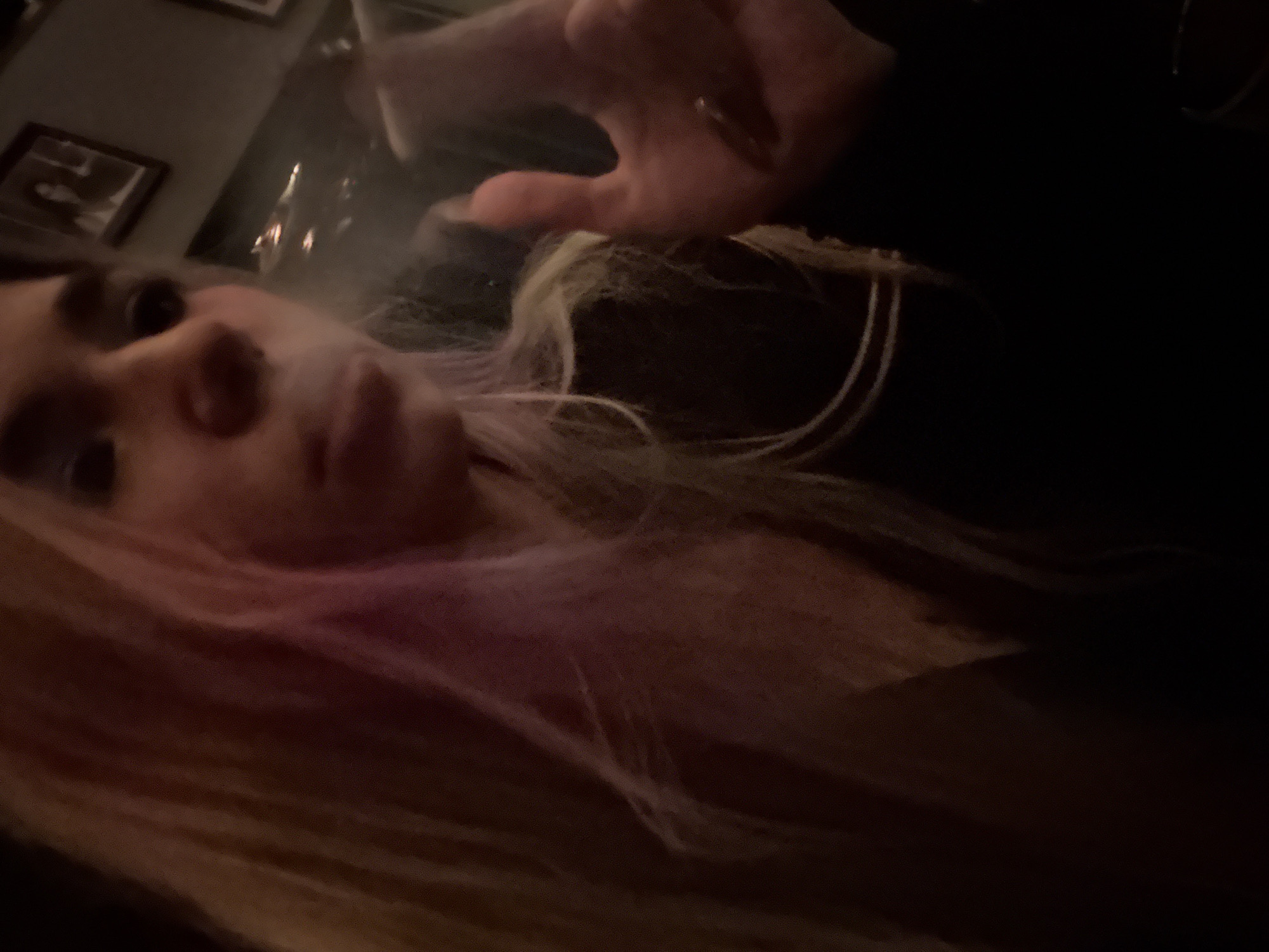 A close-up, low-light photograph depicts a female subject indoors. The individual, with long, light-colored hair featuring blonde and pinkish-purple tones, is exhaling a visible plume of smoke or vapor from her mouth. Her left hand is raised, holding a slender, cylindrical object, consistent with a cigarette or vape pen, between her fingers. Her fingernails appear dark-painted. She wears a dark garment with white horizontal stripes visible on the upper left arm/shoulder area. The background is dark and out of focus, revealing a wall with at least one framed picture depicting two figures to the upper right. Ambient light reflections are present in the blurred background. The specific location within Tel-Aviv, Israel, cannot be identified from the visual evidence provided.