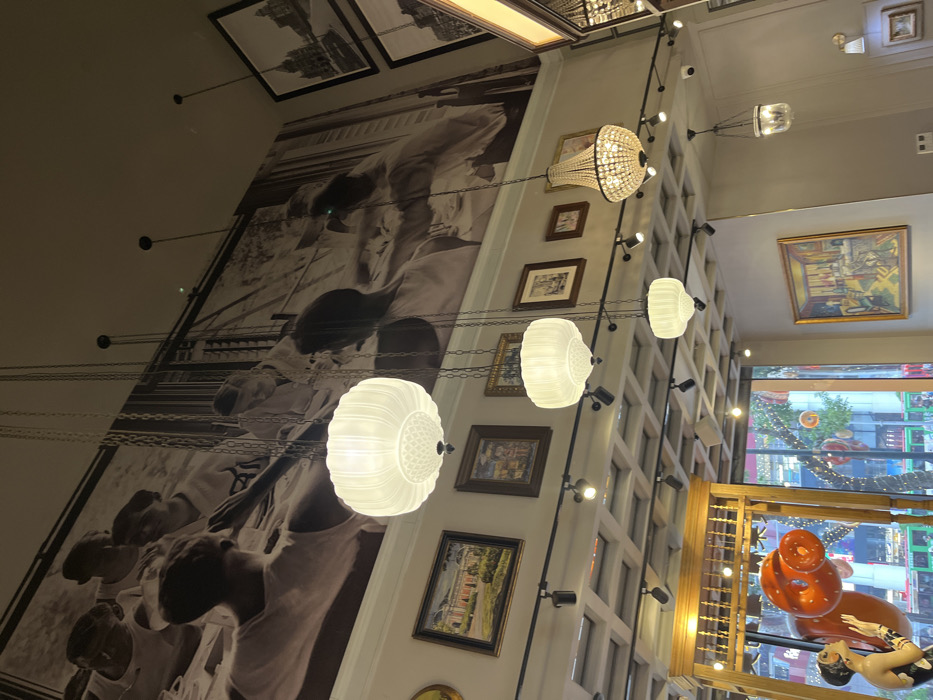 A high-angle view of a restaurant or cafe interior. On the left, a large black and white mural of people boxing adorns a wall. A vertical arrangement of decorative light fixtures hangs, beginning with a chandelier and transitioning to orb-shaped lights suspended by chains. Pictures in ornate frames hang along the wall. The right side features a window with city views, framed by a grid-patterned wall. A wooden decorative structure with a mannequin-like sculpture stands near the window.