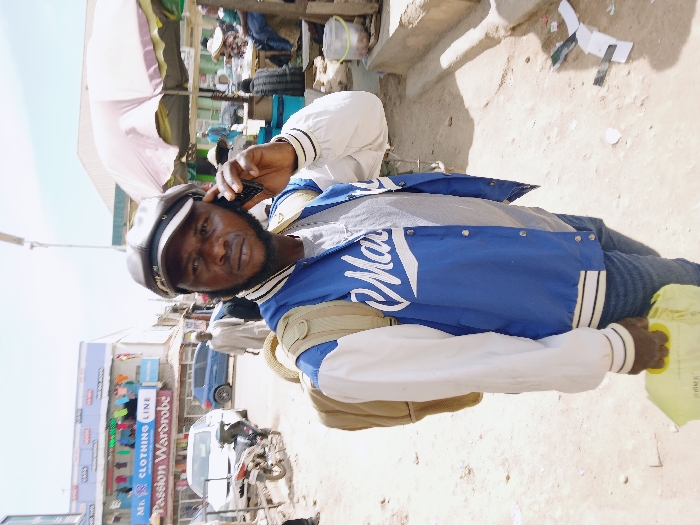 The image depicts an outdoor daytime street scene in Gweru, Zimbabwe. In the foreground, a Black male, estimated to be between 30 and 40 years old, stands with his body slightly angled to the left, looking forward. He wears a dark grey peaked cap, a light grey t-shirt, a blue and white letterman-style jacket with "Mar" partially visible on the chest, blue denim jeans, and a light brown backpack. He holds a black smartphone to his right ear with his right hand, appearing to be engaged in a call. His left hand holds a light yellow plastic bag. The ground beneath him and extending into the middle ground is unpaved, consisting of dirt and gravel, with scattered litter including paper and plastic debris. In the left background, a street is visible with parked or slowly moving vehicles, including a white sedan, a blue SUV, and a motorcycle. Behind the vehicles, a two-story building features signs for "Mr. D CLOTHING LINE" and "Passion Wardrobe," with various clothing items displayed on hangers from the upper floor. In the right background, a bustling market area is evident under a large, striped umbrella. Indistinct figures are visible interacting or seated within this area, surrounded by various goods and additional street litter. The entire scene is illuminated by bright overhead sunlight, casting short shadows.