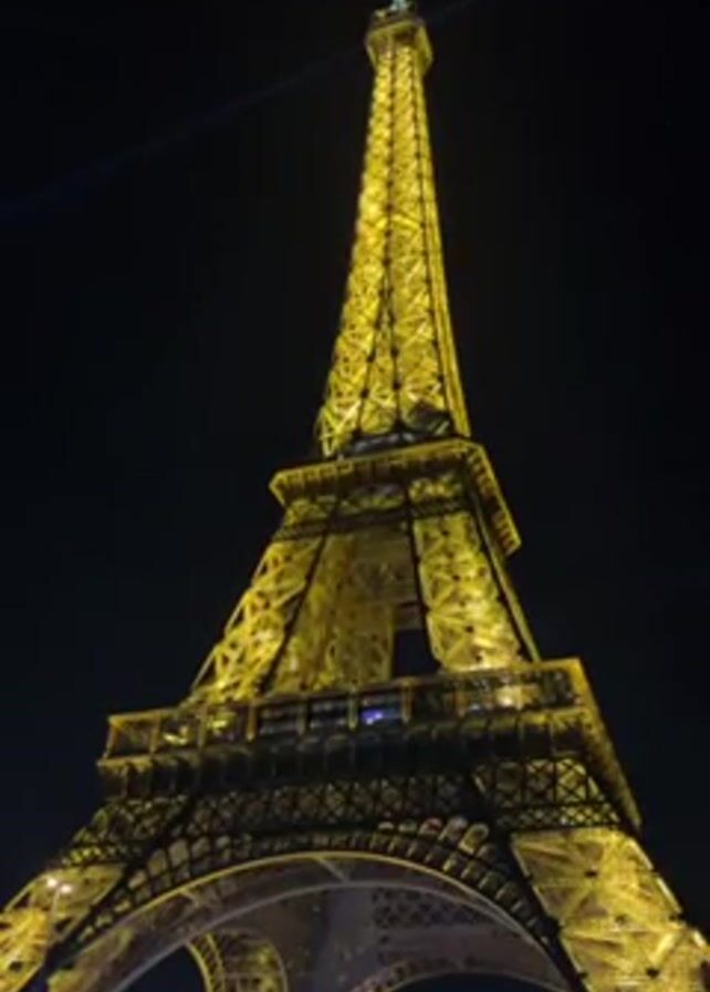 Eiffel Tower illuminated at night. It is a static, low-angle shot of the entire tower, which is lit with yellow lights against a dark sky. The tower's intricate ironwork is visible, as well as some lights at its base and a few faint lights from vehicles in the distance.