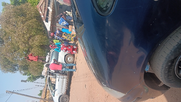 The image depicts an outdoor scene in Langtang, Nigeria, on an unpaved, reddish-brown dirt road under bright daylight. In the midground, a light-colored minivan, likely white or silver, is stationary with its front driver's side door open. Several light-colored, irregularly shaped bundles are secured on its roof rack. One male individual, wearing a red short-sleeved shirt and dark trousers, stands atop the minivan's roof, positioned among the bundles. Another male, wearing a red t-shirt and blue jeans, stands facing the open driver's side door of the minivan. To the right of the minivan, a group of approximately 5-7 individuals, predominantly women dressed in colorful patterned attire, are gathered. Further in the background, additional individuals are partially visible near a building with a reddish corrugated metal roof. One background figure is identifiable by a blue garment with white text. The foreground is occupied by the partial view of a dark blue vehicle's front left fender and hood. In the background, a large tree with green-brown foliage dominates the upper right, while utility poles and wires are visible on the upper left.