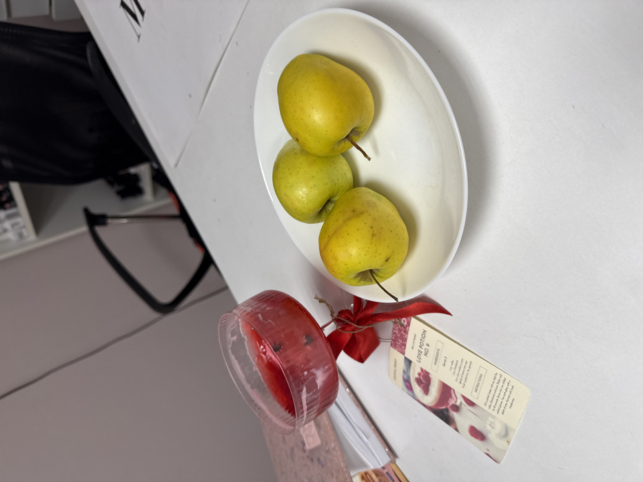 The image displays an indoor scene on a white tabletop, likely a desk. In the foreground, a white oval plate holds three yellow-green apples with visible stems. To the left of the plate, a clear stemmed glass/cup containing a red liquid with dark particulates (possibly berries or seeds) is present. A red satin ribbon is tied around the stem of the cup, from which a small rectangular tag hangs. The tag features an image of a red dessert/drink and text, partially legible, including "LOVE POTION NO. 9" and "INSTRUCTIONS." A light pink/peach colored binder or notebook is partially visible beneath the cup. In the blurred background, a dark office chair with a mesh back is discernible, positioned behind the desk. A white shelving unit or cabinet with indistinct items is also visible further back. The wall behind is a plain, light, muted color. No individuals are depicted, and no specific actions or interactions are occurring beyond the static arrangement of objects. The specific location within Sofia, Bulgaria, cannot be determined from the visual information provided.