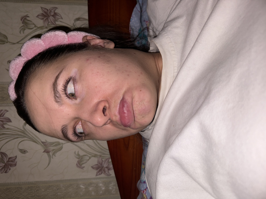 A person with fair skin, long eyelashes, and a pink headband makes a face, pursing lips and looking askew. The person is lying down against a floral-patterned wall. A wooden headboard is partially visible behind the person's head. The individual wears a white t-shirt that obscures a significant portion of the frame.