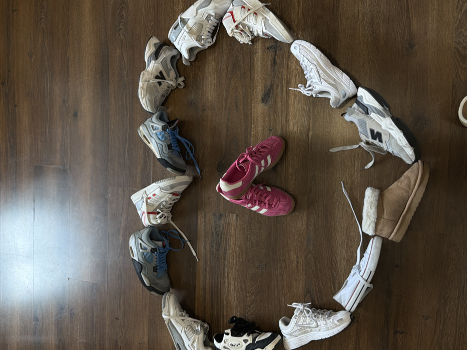The image depicts 16 footwear items arranged on a dark brown wooden plank floor in Bouxwiller, France. A pair of pink low-top athletic shoes with white stripes is positioned centrally. Surrounding this pair, 14 additional individual shoes are arranged to form a heart shape. This perimeter includes various athletic shoe models in colors such as white, grey, black, and blue, along with one white canvas low-top shoe and one tan ankle boot featuring a white faux-fur trim. The wooden floor reflects ambient light, particularly noticeable in the upper left quadrant of the scene. No individuals are present.