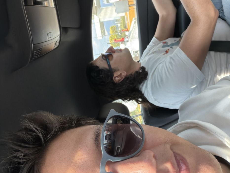 Two men pose in a car. The first man is closer to the camera and wears sunglasses. His face fills the bottom of the frame. The second man is behind him, lying back in the seat. He is wearing glasses and a white t-shirt. Part of the car’s interior is visible, including the ceiling and a window showing a sunny street scene.