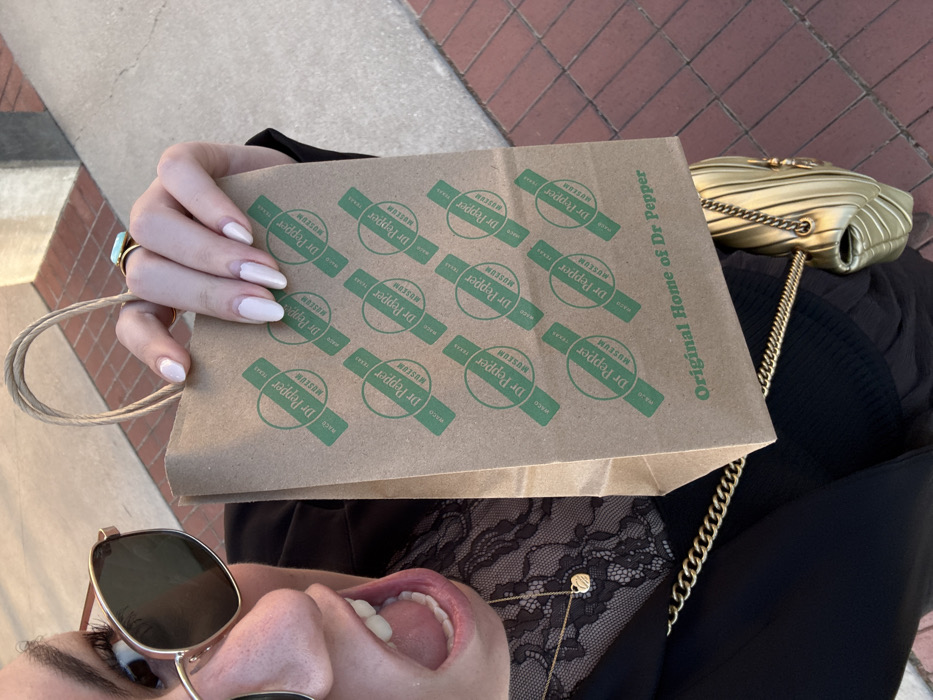 A first-person, low-angle shot features a tan-colored paper bag with green "Dr. Pepper Museum WACO Texas" logos. The bag, held by a hand with pale pink nails and a ring, rests on a black lace top and a gold purse with a chain strap. Below, a portion of a face appears, including sunglasses and an open mouth. The bag reads "Original Home of Dr Pepper" on its side. The background shows a sidewalk with brick patterns.