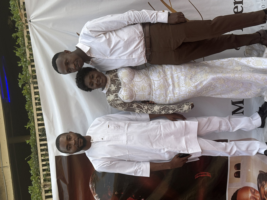 Three individuals, two males and one female, are depicted standing side-by-side, posing for a photograph. The subject on the left is a male with a beard, wearing a white traditional long-sleeved tunic with embroidery on the left chest pocket, matching trousers, and black dress shoes. He holds a dark smartphone in his left hand. The central subject is a female with short dark curly hair, smiling, and wearing a long, fitted white or off-white gown featuring a sheer high neck, embroidered long sleeves, and beaded detail on the sweetheart-style bodice; the entire dress has embroidered patterns. She is linking arms with the male to her right. The subject on the right is a male with short dark hair, wearing a white long-sleeved collared shirt, brown trousers, a brown leather belt, and brown dress shoes. His left arm is around the waist of the female subject. All three individuals are looking towards the camera. Behind them is a large white fabric banner serving as a backdrop. The banner displays a brown section on the left with an obscured image and partial text "M er" visible in the center-right, along with a golden, abstract design element on the far right. Above the banner, a dark railing, green foliage, and faint blue light are visible. The specific location within the city of Jos, Nigeria, cannot be identified from the visual information provided.