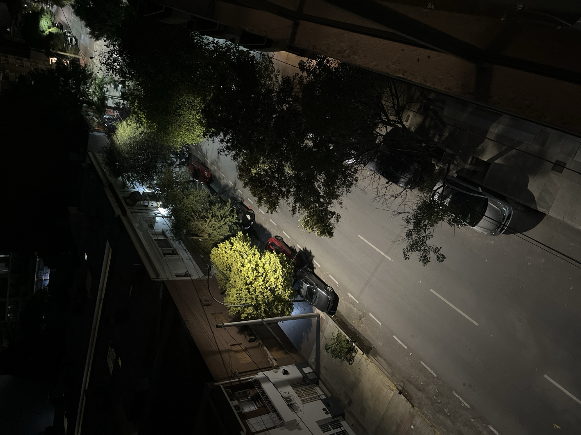 The image presents an elevated, downward-looking nocturnal view of Rivera Indarte street, near number 151, in Cordoba, Argentina. The scene is illuminated by artificial street lighting, resulting in strong contrasts between brightly lit areas, such as a prominent tree canopy, and deep shadows. A paved asphalt road, marked with faded white dashed lane lines, runs through the center of the frame, flanked by concrete sidewalks on both sides. On the left side of the street, three sedans are parked parallel to the curb: a dark grey sedan in the foreground, a red sedan positioned beneath a brightly illuminated tree, and a dark-colored sedan further down the street. Overhead utility wires extend from a light-colored utility pole situated on the left sidewalk. Buildings line both sides of the street. On the left, a multi-story building with a light-colored facade, balconies, and distinctive arched windows on its lower level is visible, consistent with the Al-Ándalus establishment at Rivera Indarte 151. Further down, another darker building is partially obscured. On the right side of the street, a darker, taller building rises, with its railing partially visible along the right edge of the frame, and a dark-colored car is partially obscured by a tree and the railing. Numerous trees with varying foliage density are interspersed along the street, with some canopies brightly illuminated by streetlights, while others remain largely silhouetted against the dark sky. No individuals are visible in the scene.