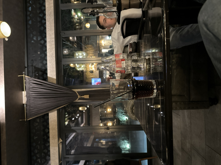 The image depicts an indoor scene within a cafe or restaurant in Silistra, Bulgaria, during evening hours. The perspective is from a seated individual, looking across a dark, reflective marble-patterned table. On the table, a clear glass contains a dark, carbonated beverage with a black straw, approximately half-full. Adjacent to it are two empty, clear glass Coca-Cola bottles, and a third empty glass tumbler. To the right, a black napkin dispenser holds white napkins, next to which a red and white cigarette pack and a dark object, possibly a wallet or phone, are placed. A male individual, seen from the chest up, is seated at the table to the right, wearing a white long-sleeved shirt and light-colored jeans. He has short dark hair and is looking towards the left, out of the frame. A leg in jeans is partially visible in the bottom right corner, belonging to the person taking the photograph. The background consists of a full-height glass window system or folding doors that reveal an outdoor patio or garden area. Beyond the glass, illuminated green foliage, numerous warm-toned decorative hanging lights, and faint reflections are visible. A distant blue screen, possibly a television or digital display, is also discernible. Above the windows, a dark grey, triangularly draped curtain is tied back with a gold tassel on a brass-colored rod. The ceiling is dark, and a textured gold light fixture is visible in the upper right. Dark, studded upholstered seating is partially visible beneath the table. The floor appears to be dark tiled.