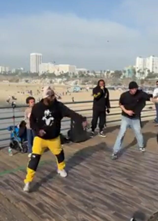 On a wooden pier, two men dance to music. The man on the left, wearing a black sweatshirt with a print, yellow pants, and a beanie, moves rhythmically. Across from him, the second man in a black shirt and light jeans mirrors his movements. Between them, a man in a black jacket holds a microphone and appears to sing. A small black speaker sits near him. Behind them, people gather to watch. In the background, a beach stretches towards a skyline of tall buildings under a clear sky.