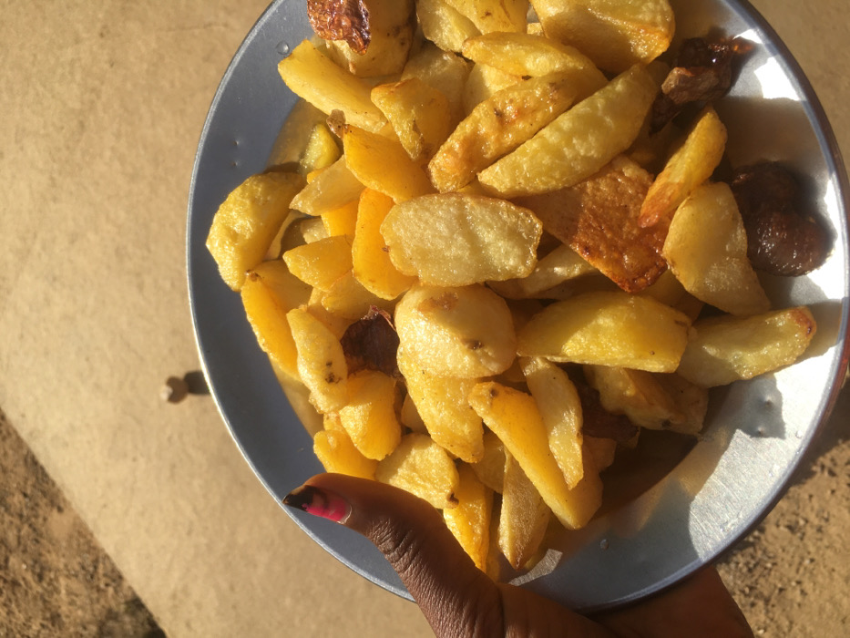 A close-up shows a blue metal plate brimming with fried potato wedges, varying in golden and slightly burnt shades. A dark-skinned hand with polished nails holds the plate, casting a shadow on the background, which appears to be a textured surface of beige and brown. The lighting is bright and creates distinct shadows. Some of the potato wedges are cut into thick, irregular shapes.