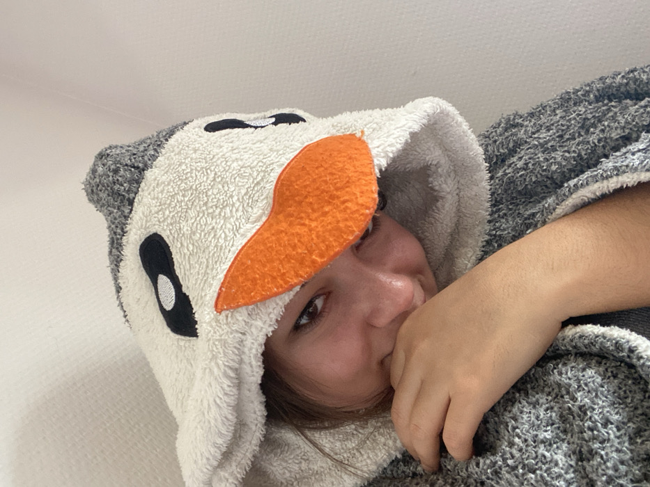 The image displays a close-up portrait of an individual, likely a young adult female, positioned indoors. She is wearing a hooded garment resembling a penguin or bird, crafted from white and gray plush fabric, featuring an orange fabric beak and black eye shapes on the hood. Her dark right eye is visible, along with parts of her face, displaying an expression consistent with a slight smile or amusement. Her right hand is raised to her face, partially obscuring her mouth. The visible portion of her attire's main body is composed of textured gray fabric. The background is a plain, light-colored wall. No specific architectural or contextual elements are discernible to determine a precise location within Bouxwiller, France.