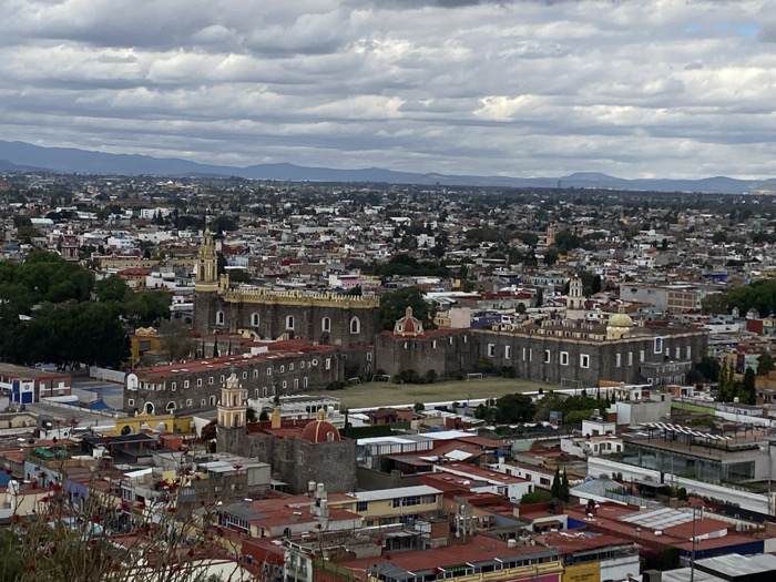 An expansive cityscape is viewed from a high vantage point under an overcast sky. Buildings of varying heights and architectural styles densely populate the scene, with a notable grey stone church complex featuring domes and a prominent yellow bell tower. Mountains are faintly visible in the distant background. The color palette is dominated by grays, browns, and reds, giving the scene a muted, urban feel.