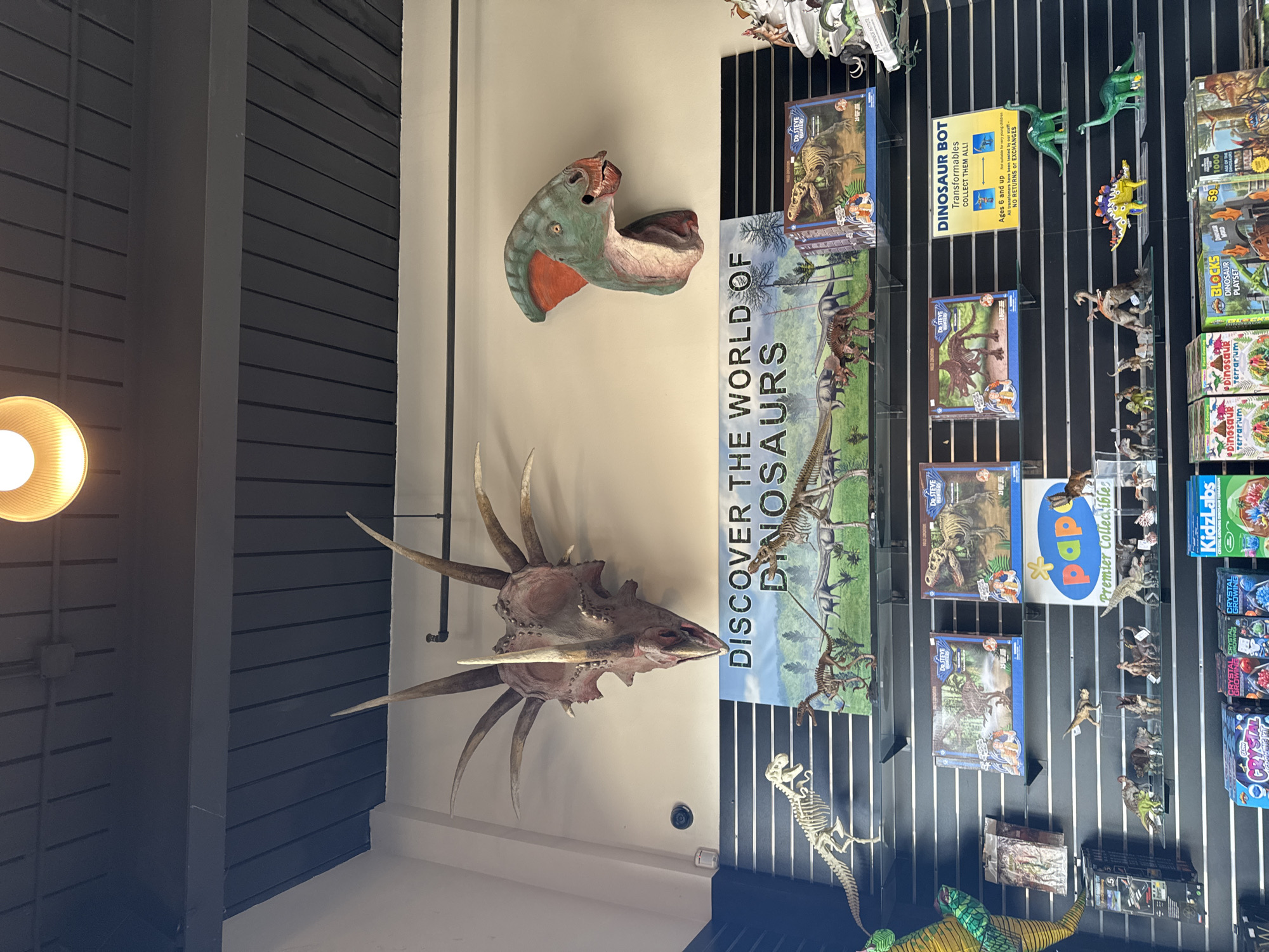 display of dinosaur-related items, possibly in a retail setting. There are dinosaur head mounts on the wall, a poster that reads "DISCOVER THE WORLD OF DINOSAURS," and shelves filled with dinosaur toys and educational kits. Brands like "DR. STEVE HUNLEY," "pap," and "KidzLabs" are visible on the products. There is a sign that reads "DINOSAUR BOT Transformables COLLECT THEM ALL!" and a lamp attached to the wall on the left side of the frame. The items are on display against a background of striped shelving. It is a dinosaur themed wall display, potentially in a store in Cocoa Beach, Florida.