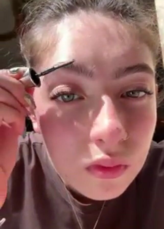 A close-up shot shows a young woman with her hair pulled back, wearing a brown t-shirt and a delicate necklace