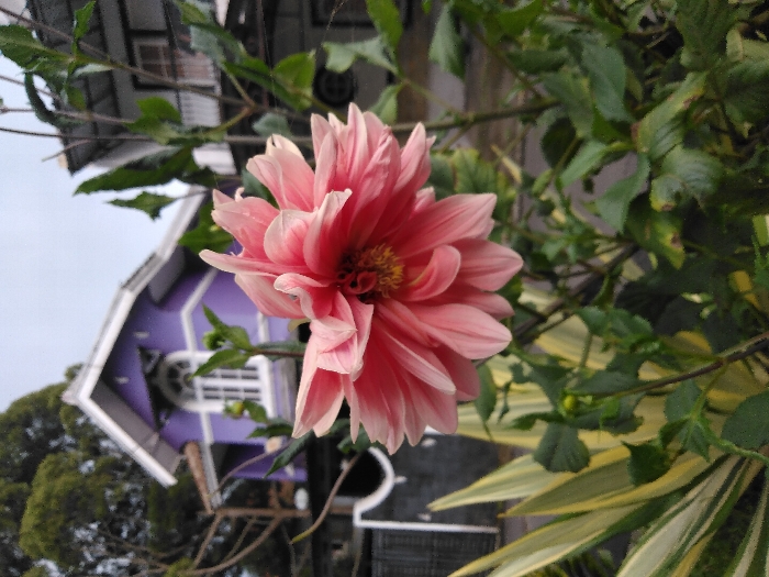 The image depicts a close-up, shallow-depth-of-field view of a pale pink dahlia flower in full bloom, observed in the city of Unknown, Norway. The flower, positioned centrally, exhibits numerous petals with lighter edges and a distinct yellow-orange center. Minor water droplets are visible on the petals and surrounding green leaves. To the lower left, a plant with variegated yellow and green broad leaves is partially visible. In the blurred background, two residential structures are discernible. The house to the left features a vibrant purple exterior, a white gable roof with dark trim, and a prominent arched white window with vertical mullions on its upper level. A dark fence or railing section is visible to its immediate left. The house to the right appears lighter in color, possibly white or light grey, with a dark roof and a visible balcony structure. The sky above is overcast and light grey. Distant dark green tree foliage is visible in the upper left background. No individuals, animals, or active interactions are present in the scene.