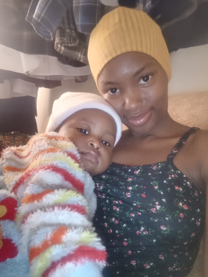 An indoor scene depicts two individuals, an adult female and an infant, in a close-up, eye-level composition. The adult female, with a dark complexion, occupies the right side of the frame, wearing a mustard yellow ribbed beanie and a dark-colored spaghetti-strap top with a small red and green floral pattern. She faces forward with a slight smile and dark, open eyes. Her left arm/shoulder appears to support the infant. The infant, also with a dark complexion, is positioned on the left, wearing a plain white beanie. The infant is partially wrapped in a fuzzy, striped garment or blanket featuring white, red, orange, yellow, and light blue sections, with a red and yellow emblem visible on the lower left. The infant's head is resting near the adult's chest, and the infant's dark eyes are open and directed towards the camera with a neutral expression. In the upper left background, folded or hanging plaid shirts (blue and white, green and black) are visible against a light-colored surface, suggesting a domestic setting such as a closet or shelf. The background to the right consists of a muted, light brown/tan surface, possibly a cushion or wall. The location is the city of Unknown, Unknown.