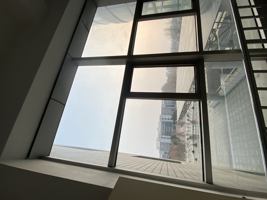 The image presents an exterior view observed from within a building through a large, multi-pane window structure