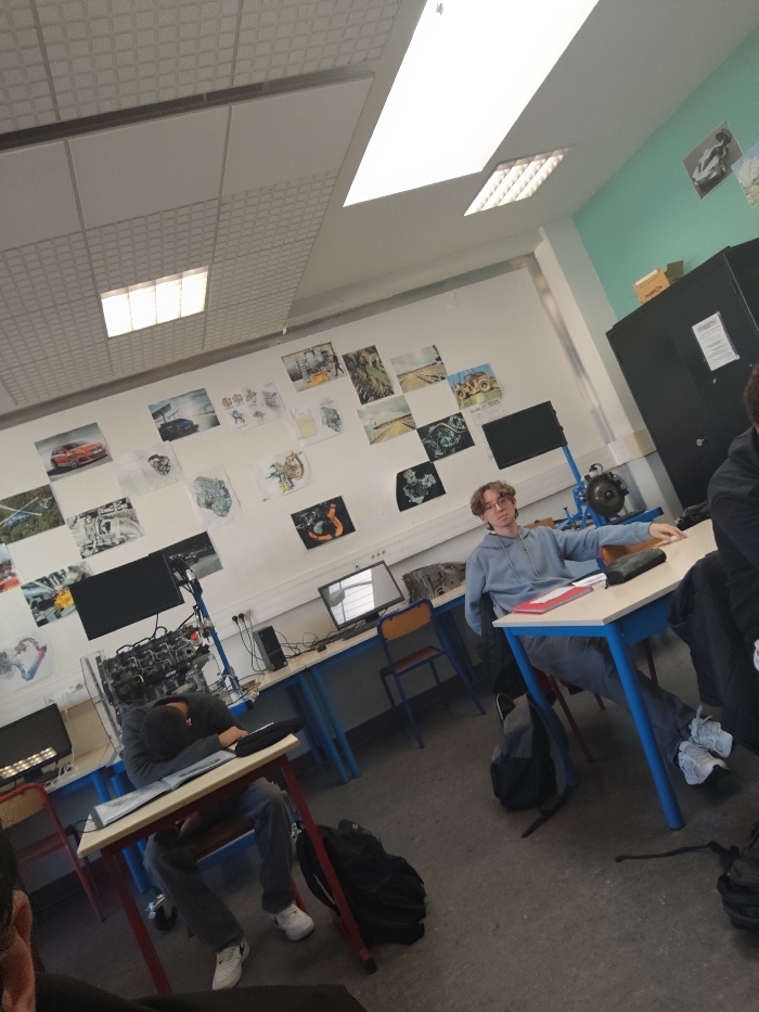 The image depicts an indoor scene in a classroom or workshop located in Schiltigheim, France. The room features white walls, with a section of the right wall painted light blue-green. The ceiling is a grid of white acoustic panels with embedded fluorescent lighting fixtures. Four individuals are visible. In the mid-ground, slightly right of center, a young male with light brown, curly hair and glasses is seated at a light-colored desk with blue legs, looking directly towards the camera. He wears a light blue hooded sweatshirt and grey pants. His left arm rests on the desk, near a red folder and a black pencil case. A black backpack lies on the floor beside his chair. To his left, in the foreground, another male student is visible from the waist up, slumped forward with his head resting on a black backpack or case on a desk. He wears a dark long-sleeved shirt and blue jeans, with white sneakers visible. This desk has red legs. A black backpack rests on the floor next to this student's desk. A third individual's ear and a portion of their head are visible in the bottom-left corner of the frame. A fourth individual's leg and side are partially visible on the far right. The wall behind the students is adorned with numerous printed images and diagrams, predominantly featuring vehicles such as cars, motorcycles, and tractors, as well as mechanical engine components. Several desks with computers or monitors are arranged along the wall. A complex piece of machinery, possibly an engine on a stand, is visible on a workbench in the mid-left background. A tall black cabinet or locker unit stands against the right wall. The floor is a uniform grey.