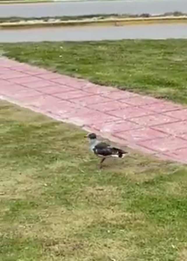 kelp gull walking on a grassy lawn next to a red tile walkway