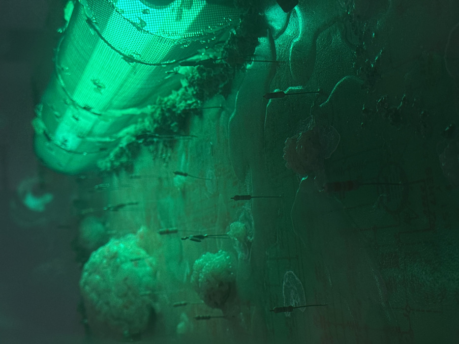 This image depicts a stylized scientific exhibit or diorama, characteristic of the displays at Micropia within Artis Royal Zoo in Amsterdam, Netherlands. The scene is bathed in an intense green light. In the midground and foreground, a dark, uneven surface, possibly representing water or an organic medium, features numerous thin, dark, vertically oriented rods, resembling miniature reeds or cattails. Many of these rods emerge from irregular, whitish-yellow organic masses that appear to be resting or growing on the surface. In the background, a prominent, segmented cylindrical structure extends diagonally from the upper right. This cylinder is encased in a fine mesh or grate and emits a strong, internal green light, illuminating the surrounding elements. Irregular clumps of dark material are visible along the base of the cylindrical structure. The lighting creates a focused, atmospheric presentation of what appears to be a microbial or biological environment model.