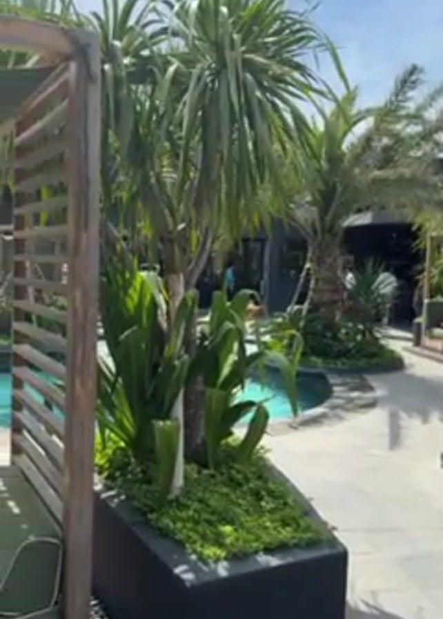 The camera pans across an outdoor resort area, with a pool surrounded by grey stone walkways and greenery