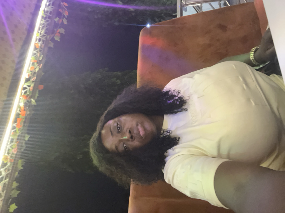 A person with dark skin and curly black hair is positioned on a brown surface. The person is wearing a light yellow garment. In the upper left corner, there is decorative lighting with foliage. The background is mostly dark with trees. A gold watch is visible on the person's wrist. The person's face is angled towards the camera, with a visible nose piercing.