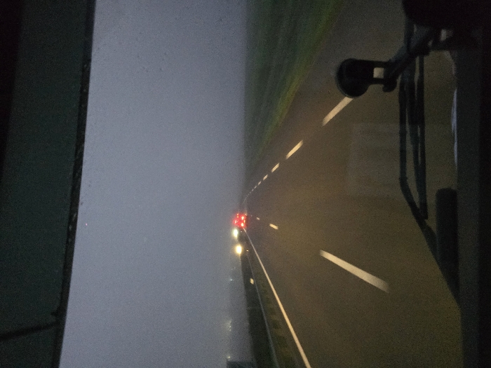 A nighttime view from a vehicle, possibly a bus, shows a fog-shrouded highway