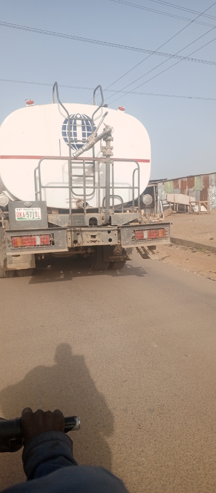 The image depicts a daytime scene in Tunga Mekidi, Nigeria, viewed from a low, first-person perspective, likely from a person on a bicycle or motorcycle. The foreground shows a dark-skinned hand gripping a black handlebar, with a dark blue sleeve visible. A prominent shadow, presumably cast by the photographer, stretches across the road surface. The central subject is the rear of a white tanker truck, positioned on an asphalt road. The truck features a large, cylindrical white tank with a blue globe-like logo (a grid pattern on a circular background) and a horizontal red stripe. A metal ladder/cage structure is present on the lower rear of the tank. A metallic nozzle and pipe assembly is mounted on the rear, pointing slightly upwards and to the left. The license plate, "DKA-571XL" (green text on white, with "LAGOS" at the top), is affixed to the left side of the rear bumper. Two circular red lights are visible on the top rear of the tank, and two rectangular taillight units, protected by metal grates, are integrated into the rear bumper. The bumper and lower chassis components appear dusty. "SINOTRUK" branding is visible on the mud flaps or lower rear of the vehicle. In the background to the right, beyond the truck, several makeshift structures are visible. These buildings are constructed from corrugated metal sheets, exhibiting varying degrees of rust and shine, along with wooden framing. The ground leading to these structures is unpaved. The sky above is clear and light blue, traversed by multiple thin, dark overhead power lines. The road surface is dark, textured asphalt.