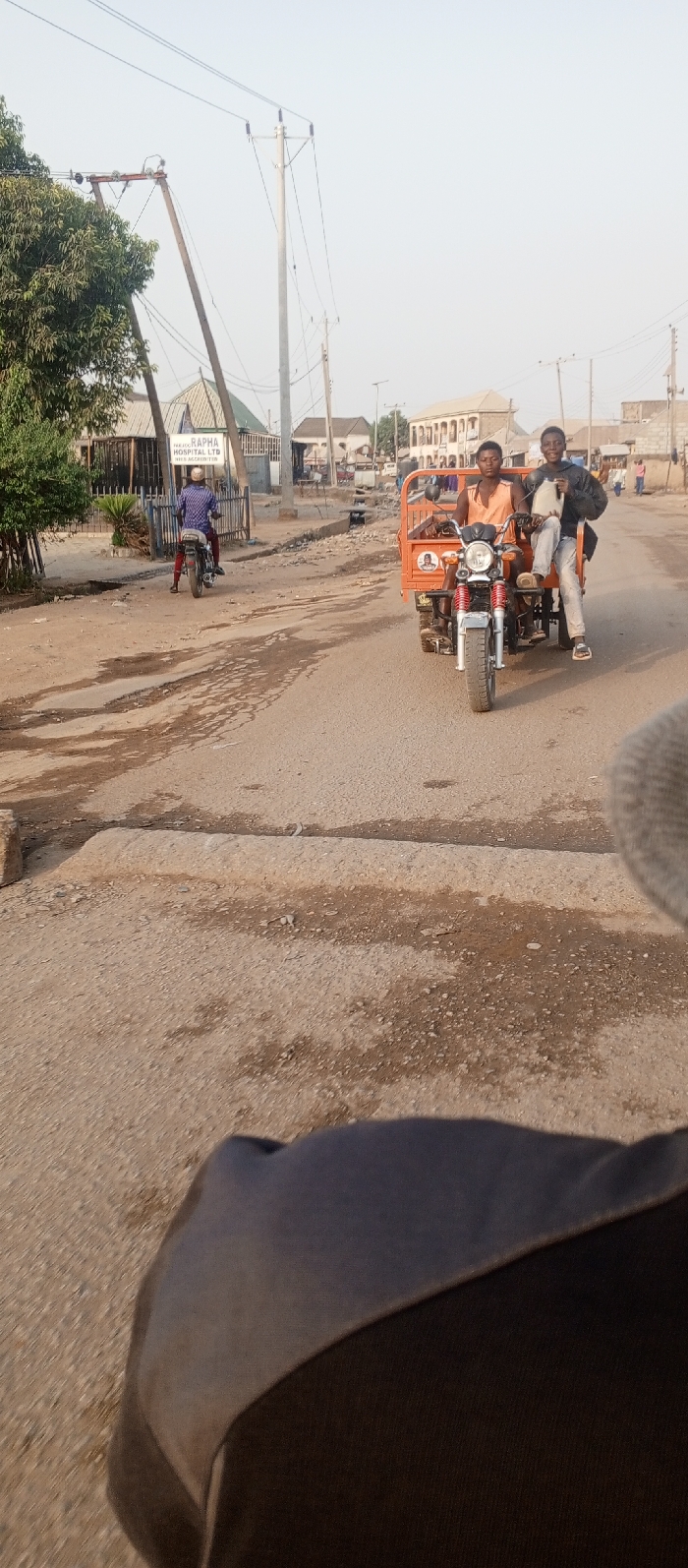 The image captures a daytime street scene in Tunga Mekidi, Nigeria. An orange three-wheeled motorcycle (keke napep) with two young male occupants is prominent in the mid-ground, traveling towards the viewer on a paved road. The male operating the vehicle wears an orange tank top, while his passenger, seated in the cargo area, wears a black jacket and light trousers, and is looking towards the camera with a smile. The road surface is asphalt, showing wear with visible cracks and uneven patches, and features raised concrete barriers or speed bumps. On the left side of the road, a second individual wearing a blue patterned shirt and a light-colored helmet rides a two-wheeled motorcycle away from the camera, passing a sign for "PARACLET RAPHA HOSPITAL LTD" in front of a building with a green roof and a metal fence. The surrounding environment includes various utility poles with overhead wires, green foliage from trees and shrubs, and multiple single and multi-story buildings lining the street in the background. The sky is clear and light. The bottom foreground shows a blurred dark surface, consistent with the photographer's immediate surroundings.