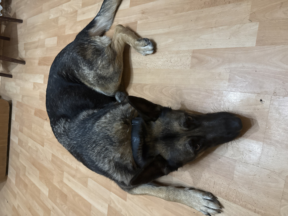 - "A medium-sized German Shepherd dog lies on a light-colored wooden floor" by FM-LKUBm1, licensed under CC BY 4.0