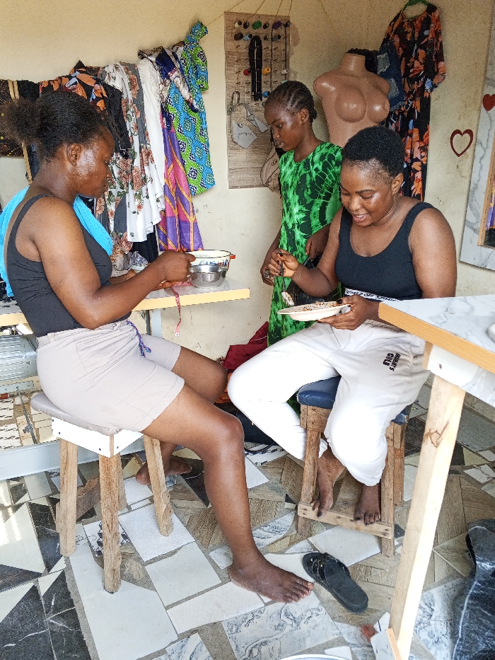 This image depicts an indoor scene in a tailoring or craft shop located in Lokoja, Nigeria. Three females are present within the workspace. On the left, a female with dark skin and dark hair pulled back is seated on a light-colored wooden stool with a white padded top. She wears a black tank top and light brown shorts with a blue drawstring, and is barefoot. Her hands are positioned over a small white bowl and a red measuring tape on a light wooden table. In the center, a second female with dark skin and braided hair stands, partially obscured, wearing a green tie-dye patterned dress. She observes or interacts with the third female, her hands near the plate held by the individual on the right. On the right, a third female with dark skin and short dark hair is seated on a wooden stool with a blue padded top. She wears a black tank top and white sweatpants with "WORLD GOLD" text on the left leg, and is barefoot. She holds a light-colored plate containing small, granular items, which she is sorting or consuming with her right hand. A black slide sandal rests on the floor beside her right foot. The background features light beige walls. Hanging on the wall are various colorful patterned fabrics and garments. A light brown textured board displays small beads or accessories and a drawn outline of a sewing machine. A headless, light brown female mannequin torso, wearing a dark patterned dress, is visible behind the central figure. Two red heart-shaped cutouts are affixed to the wall on the right. The floor is tiled with an irregular pattern of white, grey, and black tiles, some appearing uneven.
