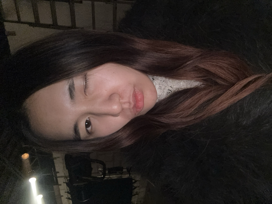 A woman winks at the camera in a close-up selfie. She has long, dark hair with reddish-brown highlights and wears a white lace top. The background is dark, possibly a room at night, with faint shapes suggesting outdoor structures. A light source illuminates the scene from the left. The woman's expression is playful. She appears to be wearing a fluffy, dark-colored coat.