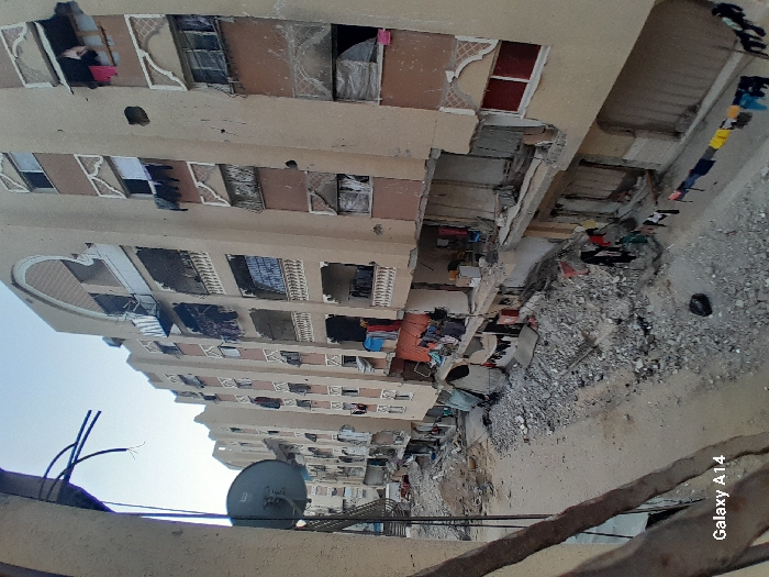 This image presents an exterior view of a street in Khan Yunis, Palestinian Territory, characterized by significant structural damage and debris
