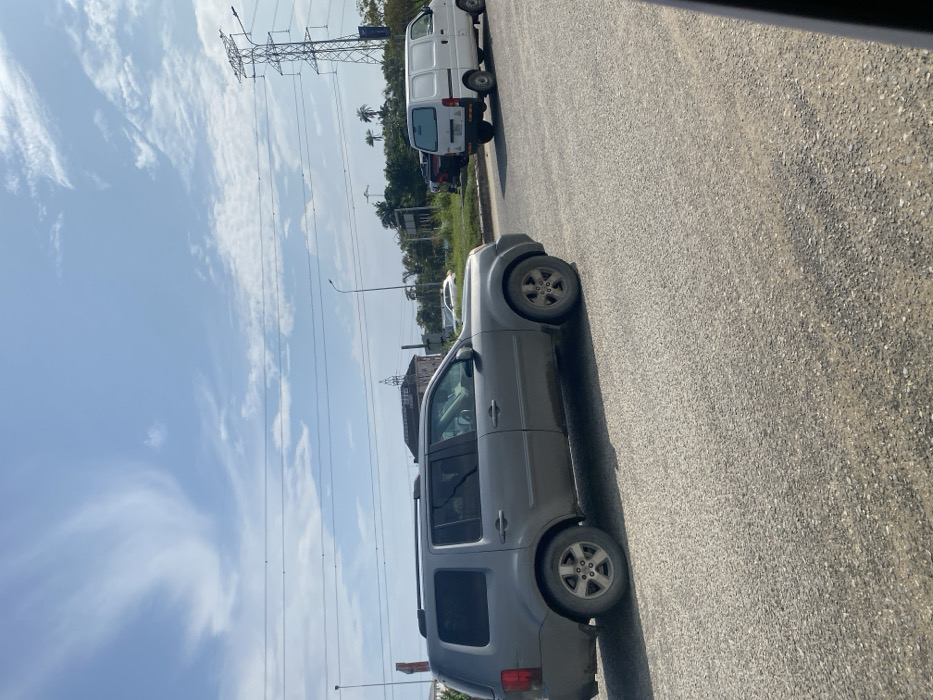 The scene, located in Ikota, Nigeria, captures a daytime exterior view under a blue sky with scattered white clouds. A dark grey Honda Pilot SUV occupies the foreground, positioned on a paved road, angled slightly right. Its lower body panels exhibit moderate dirt accumulation. In the mid-ground to the right, a white cargo van with tinted rear windows is also present on the road. The road surface is asphalt with visible aggregate. The background features dense green foliage and trees, with a prominent metal lattice power transmission tower on the right horizon and multiple overhead power lines traversing the frame horizontally. To the left, a light-colored building with a dark roof and another white vehicle are partially visible. A streetlight pole stands in the mid-ground. No individuals are visible. The environment is brightly lit by natural sunlight.