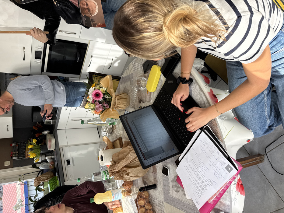 This image captures an active domestic scene within a kitchen and dining area in a residence located in Veauche, France. In the foreground, a blonde female with hair tied in a bun is seated at a round table, facing away from the camera. She wears a striped t-shirt and blue jeans, with red nail polish visible on her fingers as she types on a black Lenovo ThinkPad laptop. To her left on the table are stacked papers, some handwritten, resting on a pink folder, accompanied by a black stylus. To her right, a yellow eyeglasses case, a black smartphone, and a clear glass are present. The table, covered with a grey tablecloth featuring a red floral pattern, is heavily laden with various items: a bouquet of colorful flowers wrapped in brown paper, multiple clear glass bottles of mineral water (one labeled "BADOIT"), a yellow plastic bottle of liquid, a plastic container of pastries, several brown paper bags containing food items, a roll of paper towels, an item wrapped in aluminum foil, a small black cylindrical object, and a small white square device. To the left of the table, a young male with dark, curly hair, wearing a dark red hoodie, is partially visible, seated and looking towards the left with his mouth slightly open. In the background, standing in the kitchen area, a male with glasses, dressed in a light grey long-sleeved shirt and blue jeans, is focused on a smartphone held in both hands. The kitchen features white cabinets with silver handles, a black countertop, a black built-in Bosch oven, and a white Electrolux dishwasher. A window allows natural light into the room, illuminating a windowsill with yellow tulips and other plants. A spice rack and various kitchen utensils are visible on the counter. To the far right, partially obscured, a female wearing a black jacket and blue jeans holds a light-colored wooden stick vertically with her right hand. A patterned pouch or bag, depicting a face, is tucked under her left arm. The floor is tiled.