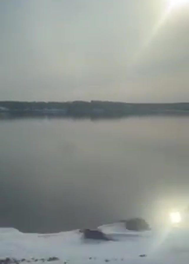 winter scene by a body of water, likely a lake or river. A dark, coniferous tree stands in the foreground, silhouetted against the bright sun. The ground is covered in snow. The water is calm, with a shimmering reflection of the sun on its surface. In the distance, a hazy shoreline can be seen. The camera pans slowly to the right, revealing more of the water and the snowy bank. The overall mood is serene and cold.