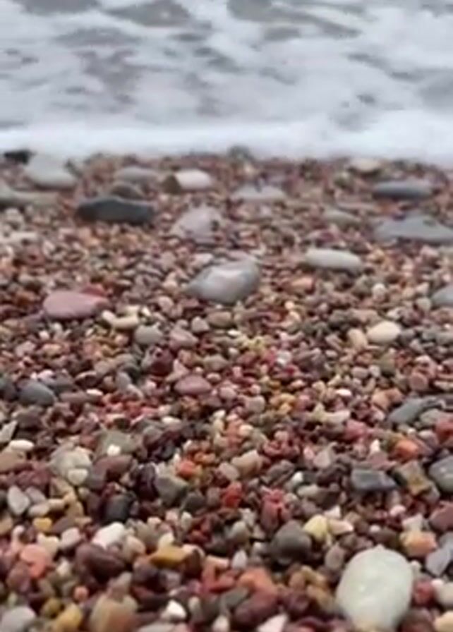 The video opens with a close-up shot of a beach covered in small, colorful pebbles. Predominantly red and brown hues dominate, interspersed with grey and white stones. The camera angle is low, focusing on the pebble-strewn surface. As the video progresses, a wave rushes in from the ocean, its white foam momentarily obscuring the pebbles. The water quickly retreats, leaving the pebbles visible once again. The ocean water is gray in color.