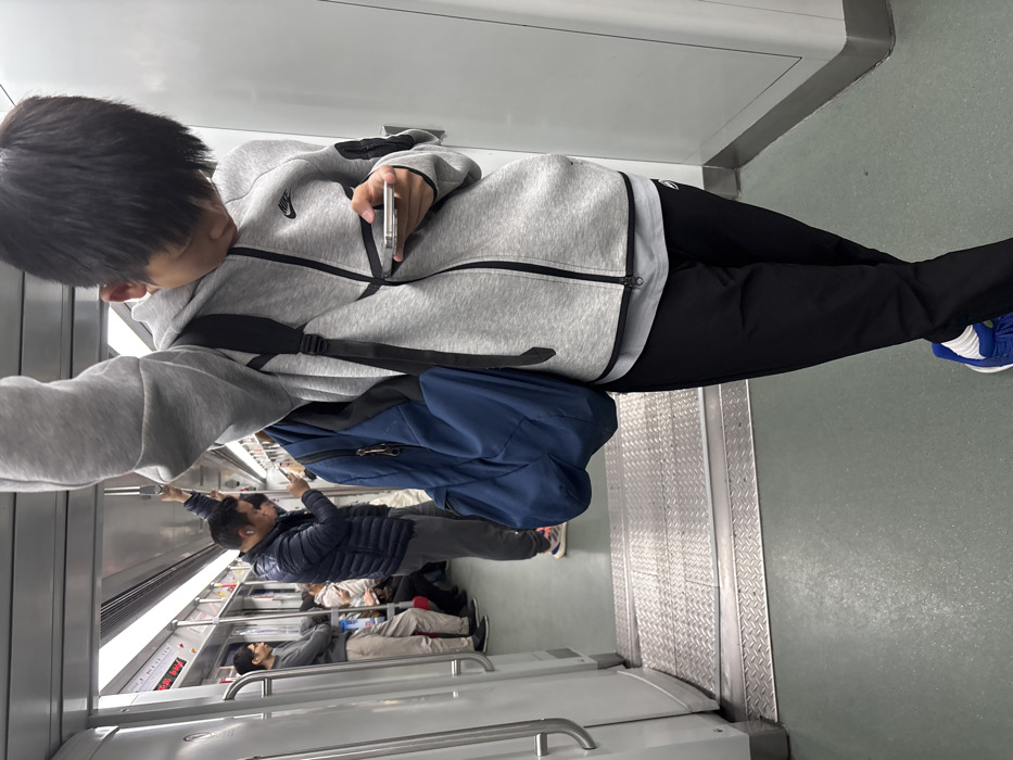 Inside a train, a person with dark hair, wearing a gray zip-up hoodie, black pants, and blue sneakers, stands holding a phone