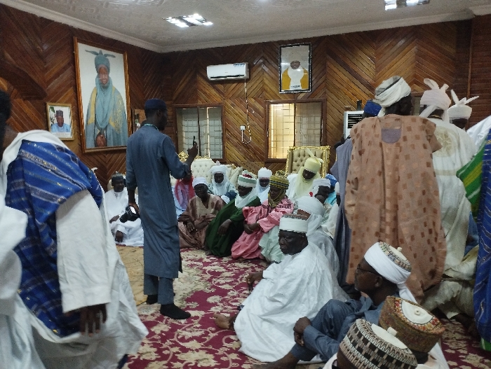 A group of people are gathered in a room, seated in a circle. They are all dressed in white, with some men wearing traditional hats and others wearing robes with a blue and white checkered pattern. The man in the center of the image is wearing a blue shirt and grey pants. The walls are wood-paneled, and there is a framed photograph of a man hanging on the wall to the left of the room. There is also a small air conditioning unit on the wall to the right of the room. The room has a red, carpeted floor. The scene takes place in a meeting room in Kaltungo, Nigeria, at the coordinates 9.816 latitude and 11.315 longitude. The people appear to be engaged in a conversation, though the precise nature of the interaction is unclear. The setting suggests a formal gathering, possibly a religious or community meeting.