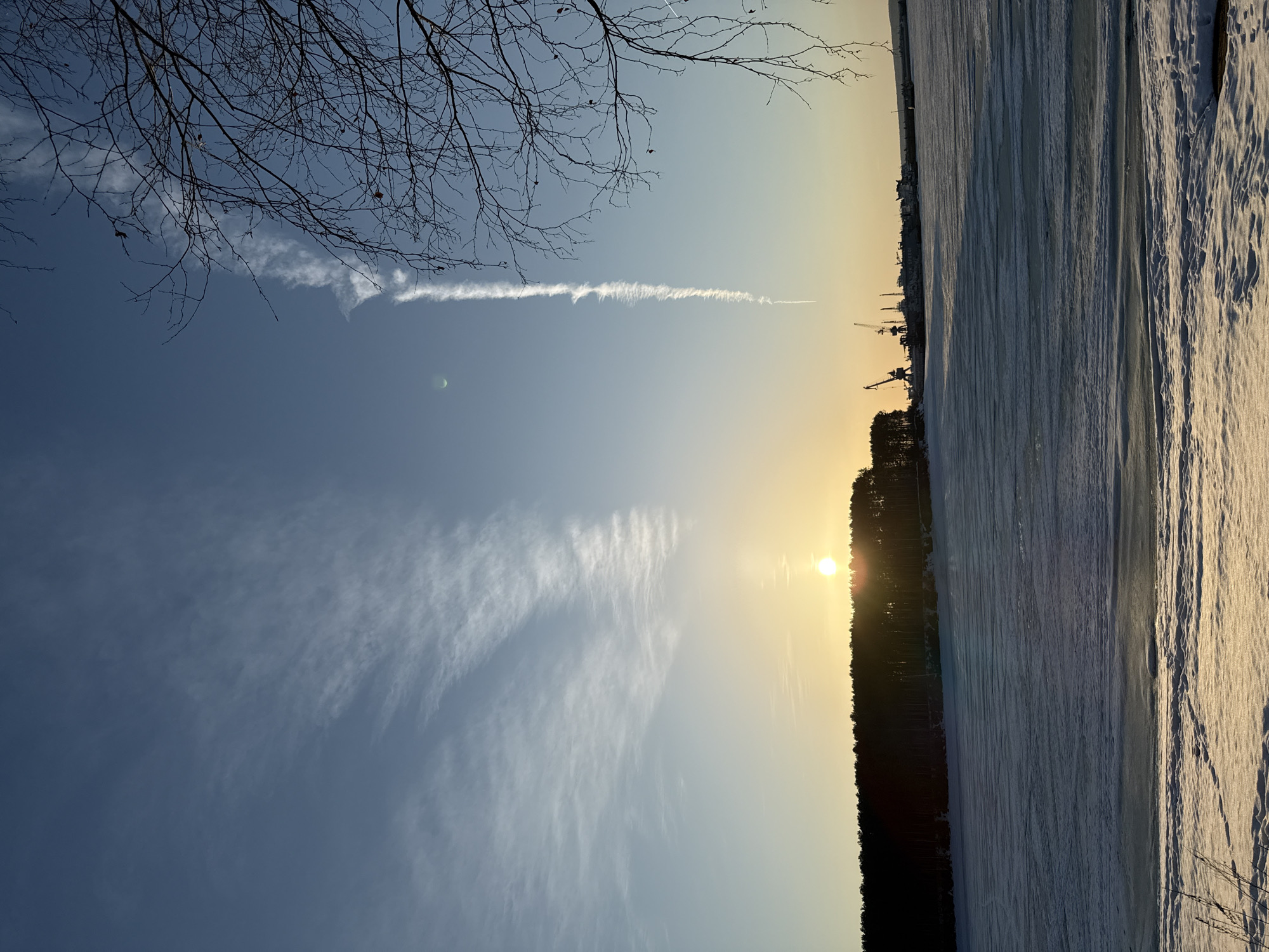 The image depicts a landscape in Chaikovsky, Russia, on a winter day. A partially frozen body of water is visible, with a layer of ice covering part of its surface and snow-covered banks on the right. A dark treeline runs along the horizon, separating the water from the sky. The setting sun casts a warm glow, partly obscured by the treeline. In the sky, there are contrails and thin clouds. In the upper left corner, branches of a bare tree are visible. In the background, industrial cranes are silhouetted against the setting sun.