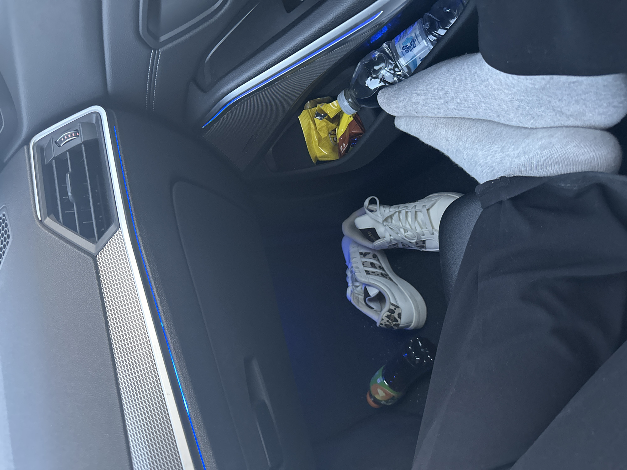 The image appears to be taken from inside a car. The interior features a dark dashboard with a textured silver accent, and blue ambient lighting. On the passenger side, there is a small compartment containing a bottle of water and a bag of potato chips. A person wearing gray socks and black pants is visible. On the floor, there are two white sneakers with black and white leopard print detailing, and a bottle of juice. The location in Kirkovo, Bulgaria is not identifiable from the image.