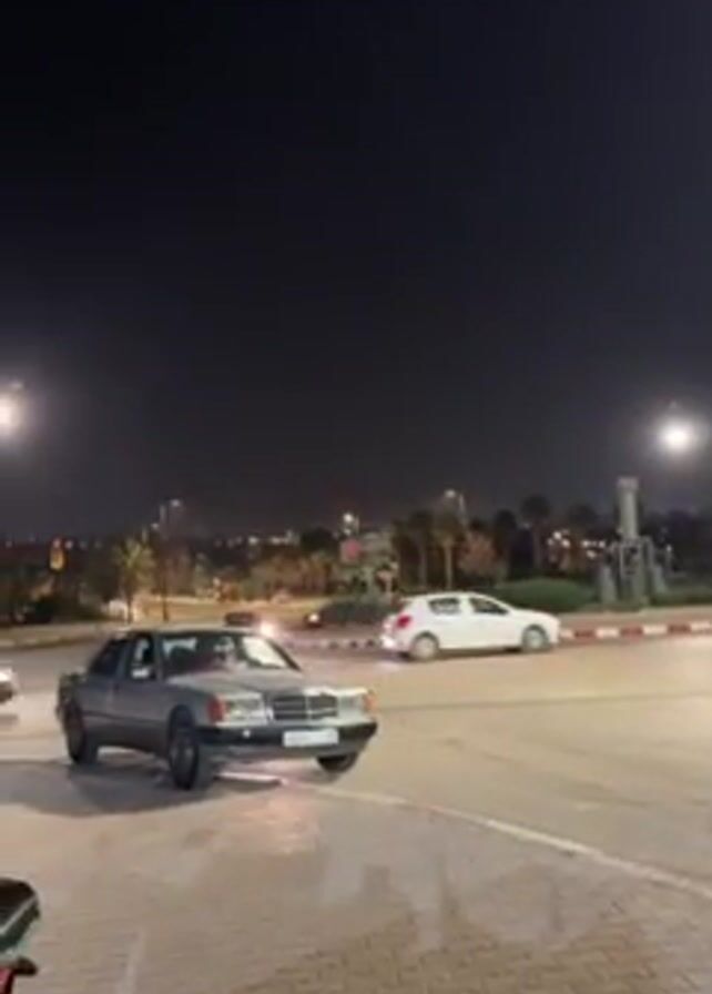 At night, a gray Mercedes-Benz sedan sits idle at a roundabout with other cars passing by. The roundabout is paved with large, light-colored blocks. A man in a hooded sweatshirt and a blue backpack walks past the car. In the background, city lights illuminate buildings, including a tower. Palm trees and streetlights line the road. The sky is dark. The video is taken from a low angle, possibly from a motorcycle.