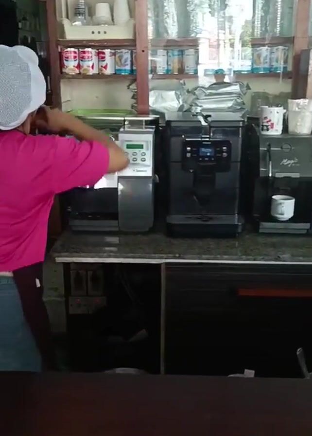 A woman is seen in what appears to be a small coffee shop. She's wearing a pink shirt, blue jeans, a dark apron, and a white cap, and she has a white face mask on. She retrieves a cup from a shelf and places it on a silver-colored coffee machine. There are multiple coffee machines behind the counter. Above the machines are shelves containing cups and other containers. A "Self-Service" sign is visible. The counter in front of her is made of dark wood.