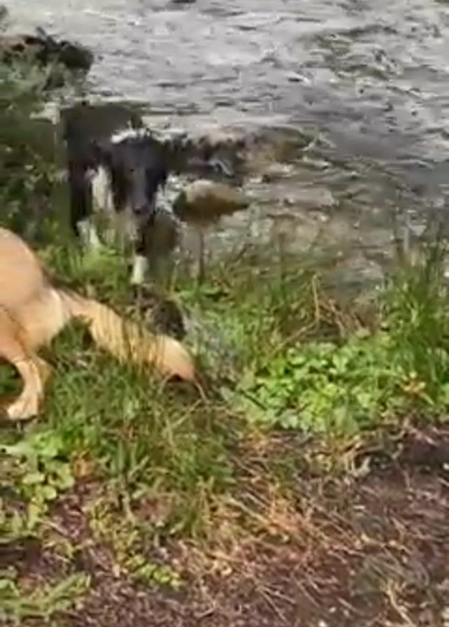 The video depicts a black and white dog emerging from a flowing river or stream
